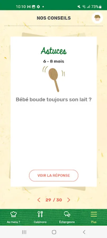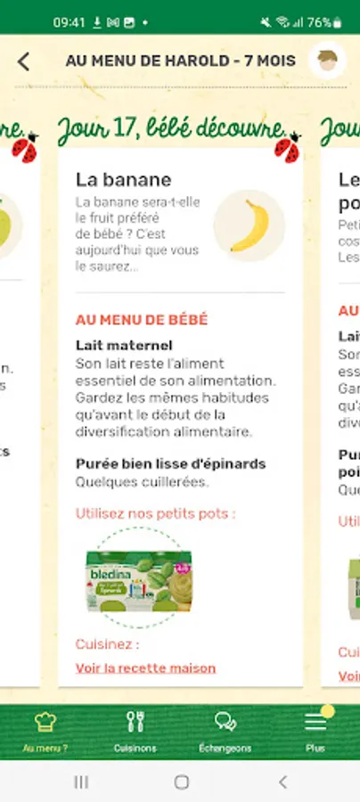 Every day, BlédiPOP offers you varied menus adapted to your baby's age while awakening his taste buds over the days. Find daily proposals for breakfast, lunch, snack, dinner, adapted to their nutritional needs. With BlédiPOP, day after day, preparing baby's meals becomes child's play! BlédiPOP is also advice and tips to live serenely all stages of your baby's diet.