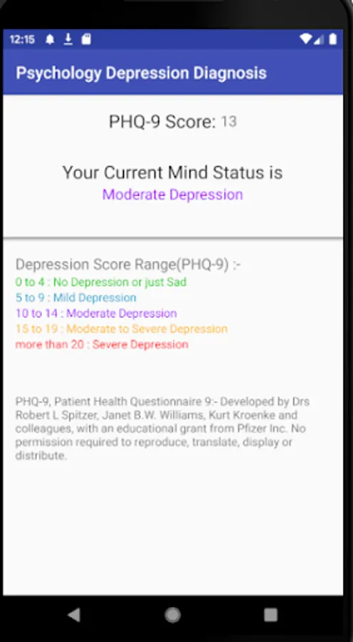 Sometimes Depression is difficult to diagnose because it is difficult to differentiate a person with sadness and depression. Not all sad persons are depressed due to which there are high chances of miss-diagnose for Clinical Depression. That's why Psychology Self Depression Diagnosis Tool provides an provide an easy way to evaluate your mental state based on mood and Anhedonia over past few weeks and our complex algorithm calculate your mental state to provide you reliable diagnostic results.