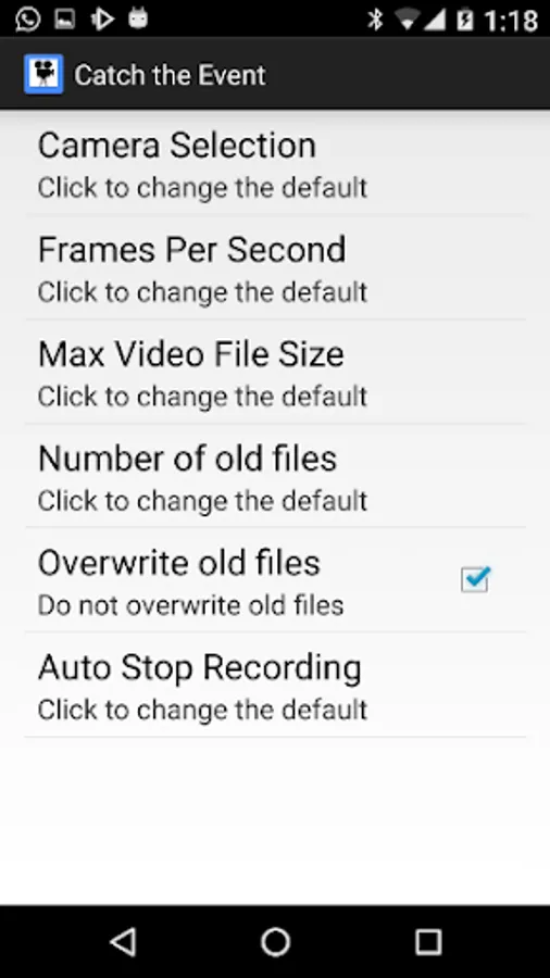 Depending on the amount of free memory your Android device has, Choose the "Number of old files", "Max Video File Size" and "Frames Per Second" options in the Preferences menu.