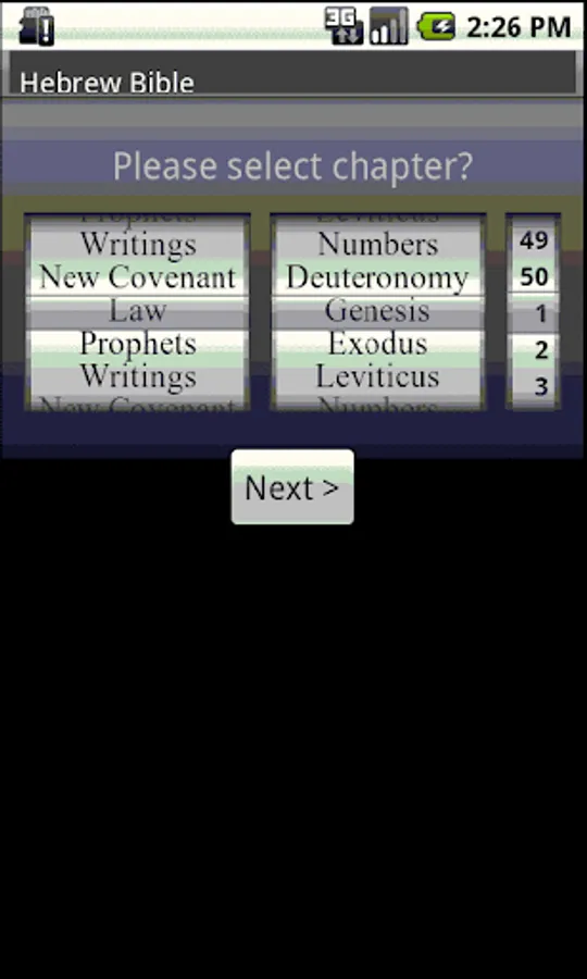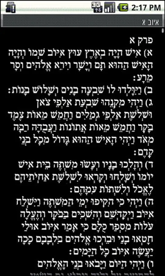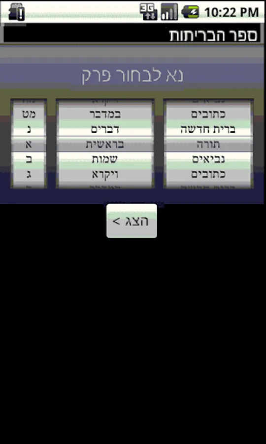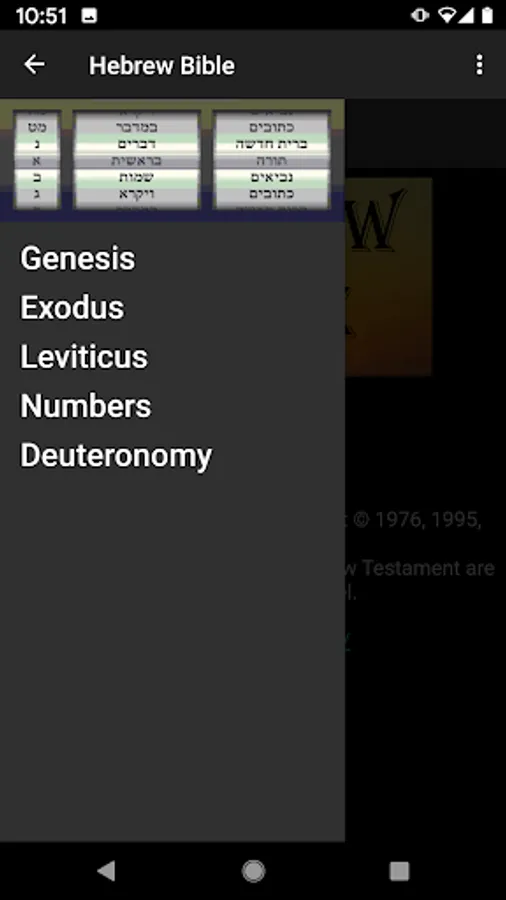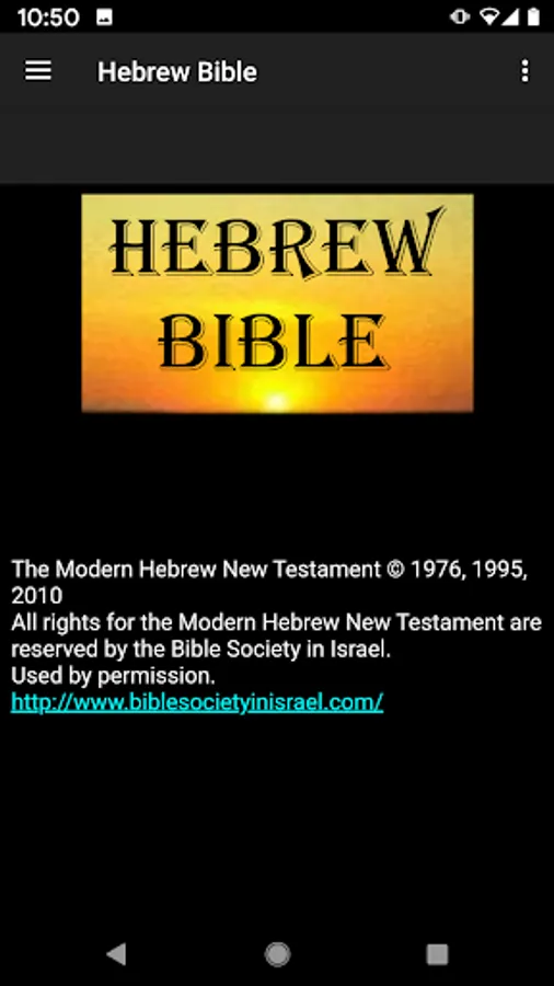 This Bible app will display in Hebrew with vowel points, the book and chapter you have chosen. You can select either Hebrew, English or a few other languages as the interface language, but the scripture will be displayed in Hebrew. It uses the Modern Hebrew New Testament by permission from the Bible Society in Israel. You can scroll text or pinch and zoom font size. In the options menu, you can choose to save the font size, black text on white background or choose a standard menu in place of the original rolodex menu.