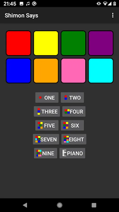 Choose a matrix of buttons from 1 to 9 or a 12 key piano. It will play 2 or 3 tones highlighting the colored buttons. Repeat the pattern by pressing the buttons in the same sequence. If correct, it will play a longer sequence up to a limit of 10 tones. It will keep your best time if you complete the level. For a one button game the sequence includes short and long tones. You can choose to build on the same pattern or a new pattern each round. You can also just play a simple piano keyboard.