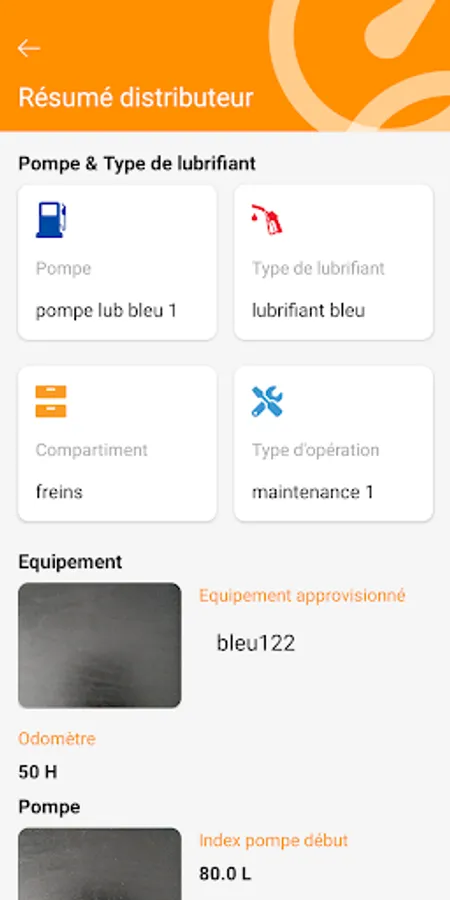 >Record all fuel and lubricants distributions with volume, products, equipment ID, hours of operations, mileage….