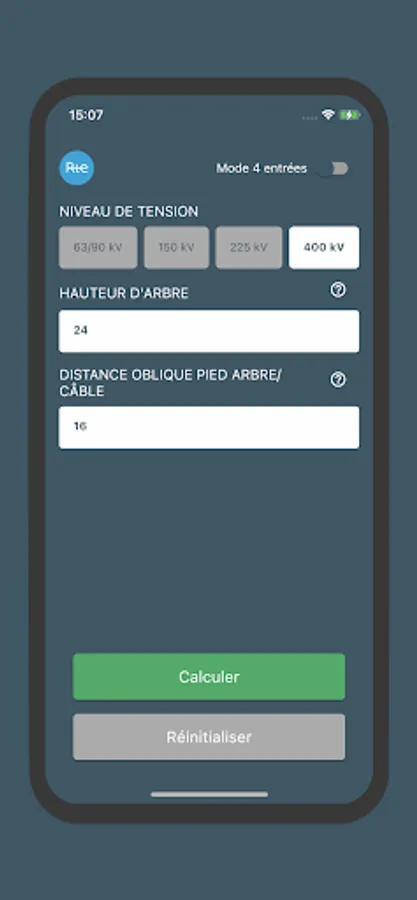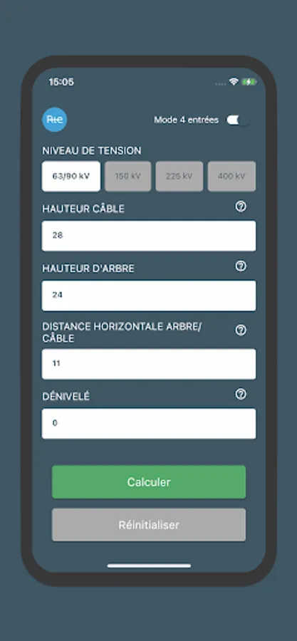 4-input mode: cable height, tree height, horizontal distance between the base of the tree and the cable, and height difference.