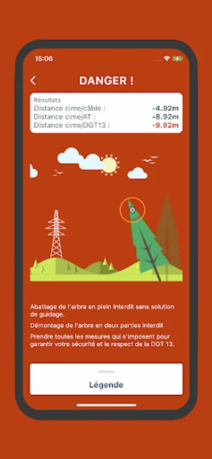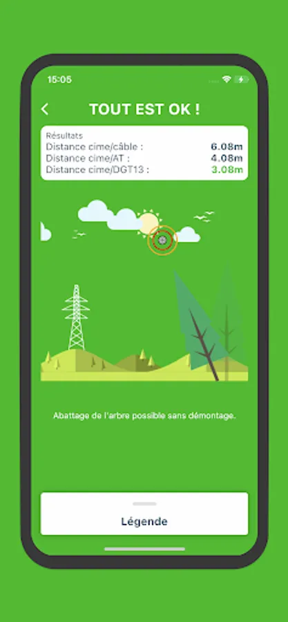 - Zero risk (green color): DGT 13 is not engaged: the tree can be felled in full without guidance or dismantling solution.