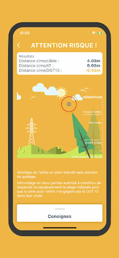 - Proven risk (orange color): DGT 13 (minimum) is engaged: felling is prohibited without a guiding solution, but dismantling in two parts is authorized by scrupulously respecting the height range indicated to cut the first part of the tree.