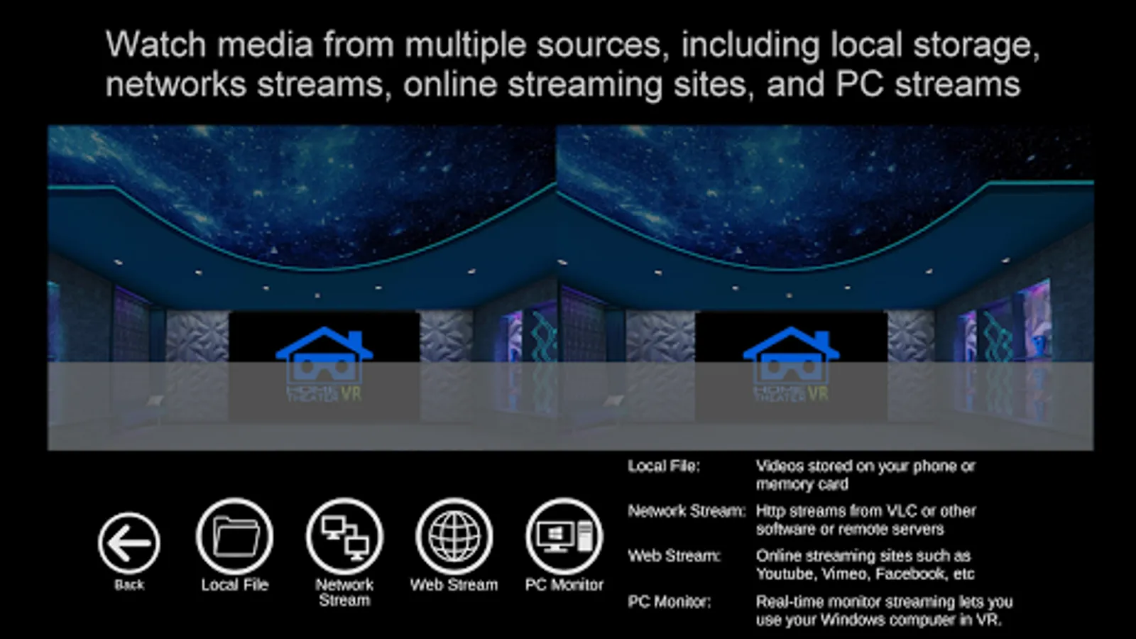 Home Theater VR is an advanced virtual reality video player, PC streamer, Web Browser, and Image Viewer. It's designed to be compatible with nearly every Android phone and headset.