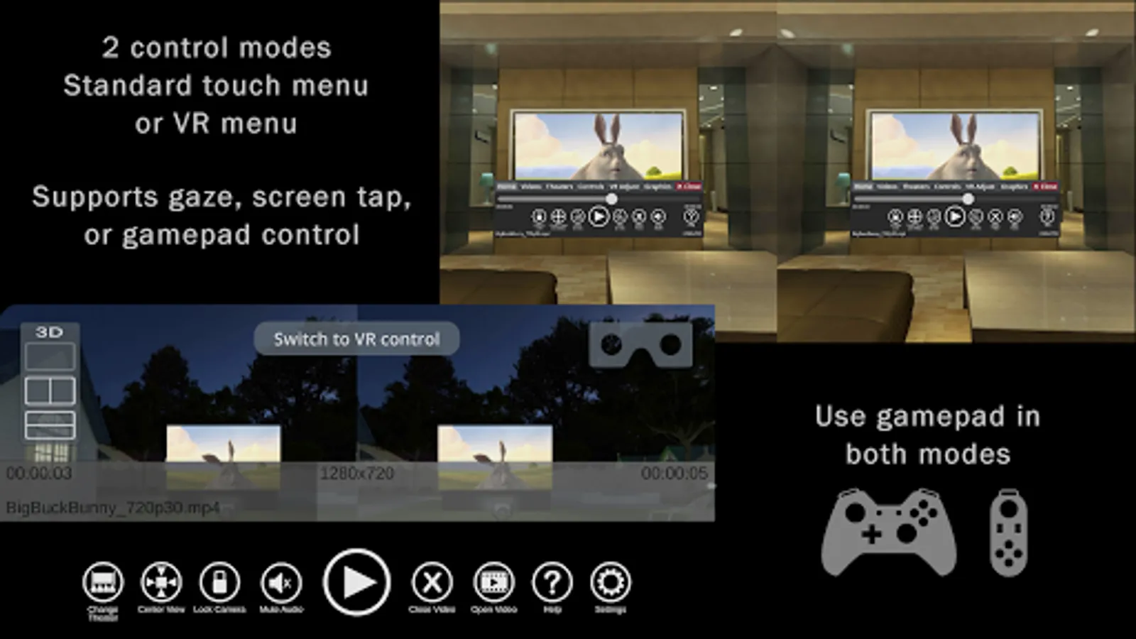 • Full control of the app without taking off your headset. Click the VR menu using gaze, gamepad, or screen tap.