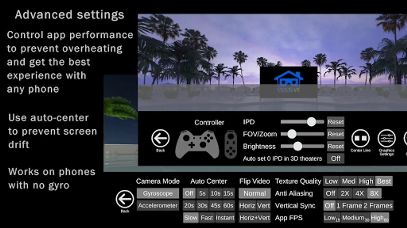 You have the ability to control everything about the app, from inside the app, without being dependent on any external VR services. It doesn't require that your phone is compatible with Cardboard, Daydream, GearVR/Oculus, or anything else. All adjustments including IPD are handled using the built-in settings.