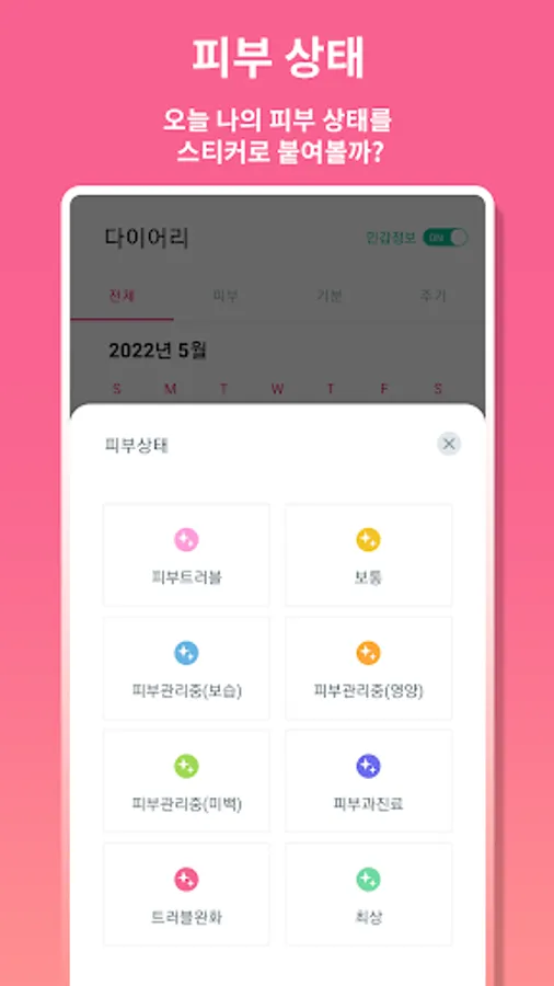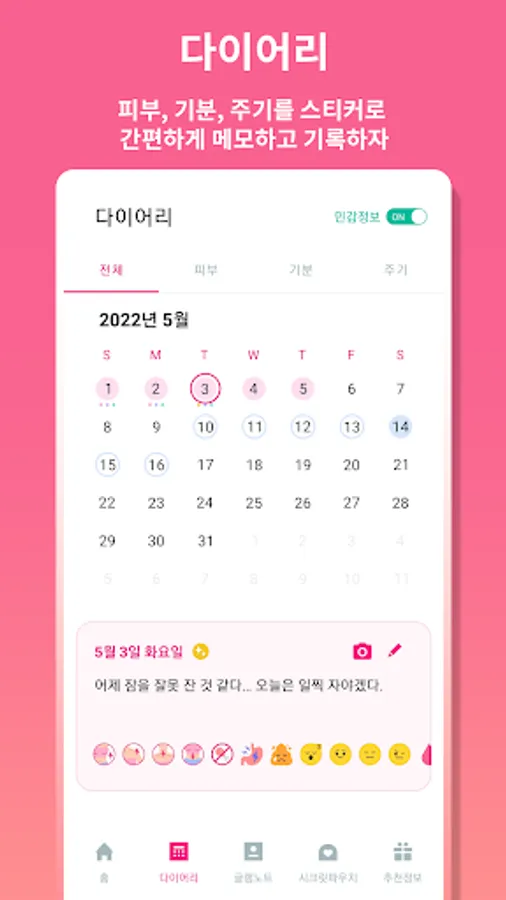 ▶ 나만의 다이어리예요: 나의 몸 상태에 맞추어 나의 생리주기에서 반복되는 고유의 패턴을 더욱 잘 이해할 수 있어요.