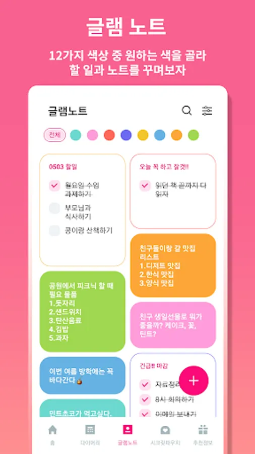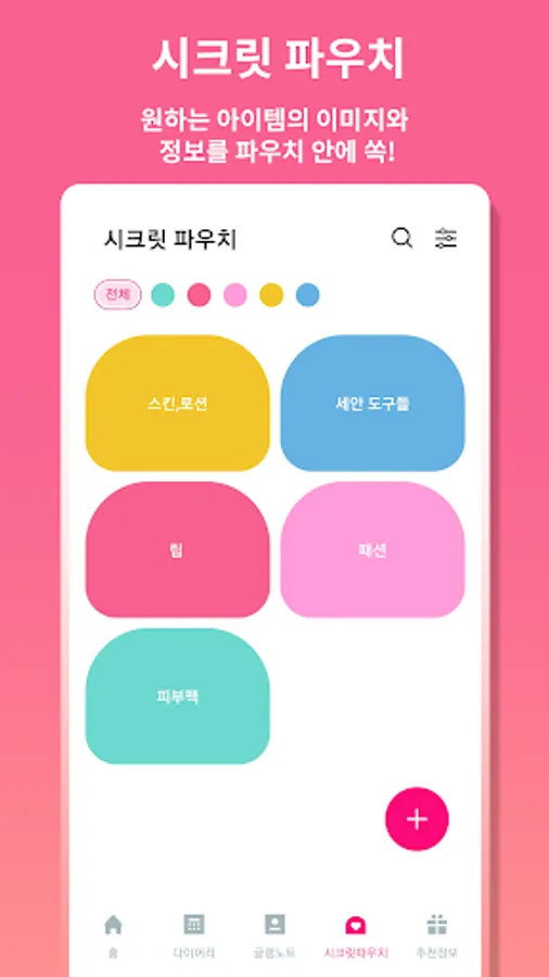 글램파우치에 나만의 다이어리와 뷰티 아이템을 담아보세요. 다이어리에 일상 메모도 기록하고 기분 스티커도 남겨서 하루하루를 기록해 보세요. 또 하나 생리 주기에 따라 생리 예상시기 알림으로 몸상태 및 배란기를 안정적으로 관리할 수 있도록 도와줍니다. 생리 기준에 따라 피부상태와 생리 전 증후근 (PMS) 증상을 기록하면서 생리 주기가 신체와 전반적인 건강에 어떻게 영향을 미치는지 확인해보세요. 시크릿 파우치에 내 파우치를 사진으로 남겨서 나만의 뷰티 노하우를 저장하시고 SNS에 공유해서 뽐내보세요. 글램 노트에서는 다양한 칼라의 메모지에 메모도 남기고 할 일 목록도 만들어서 활용해 보세요.