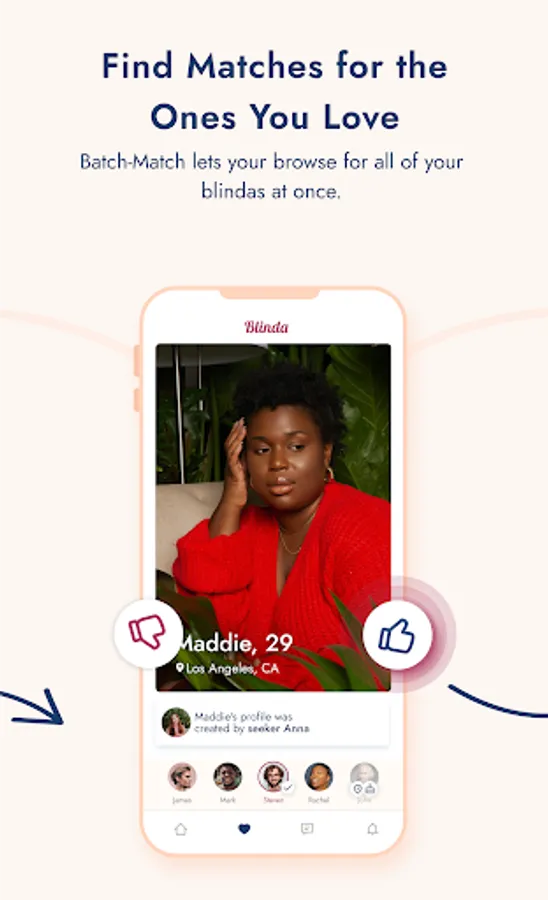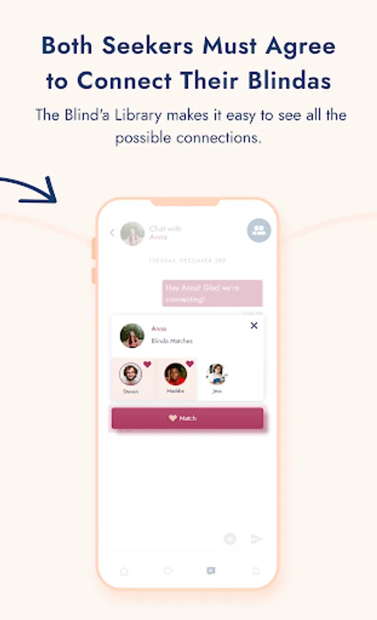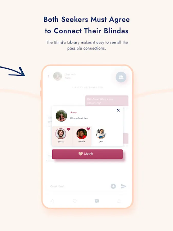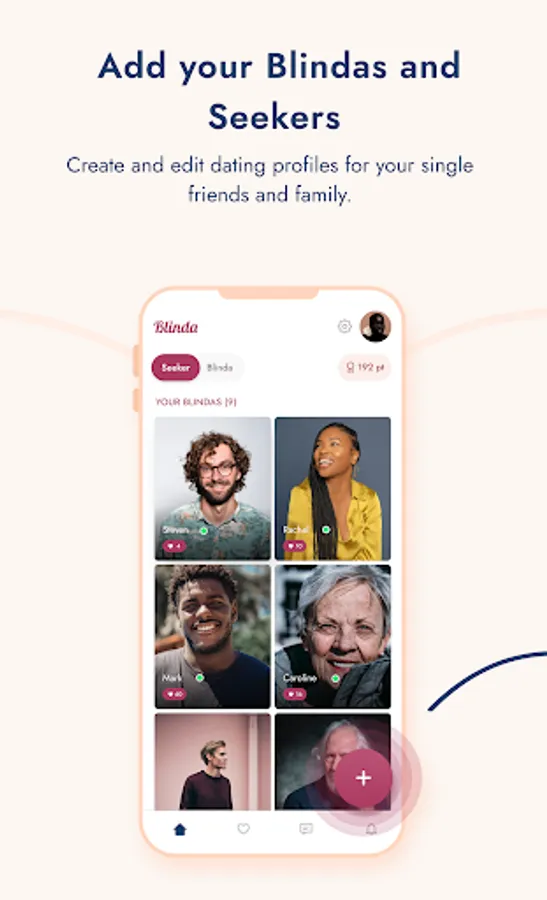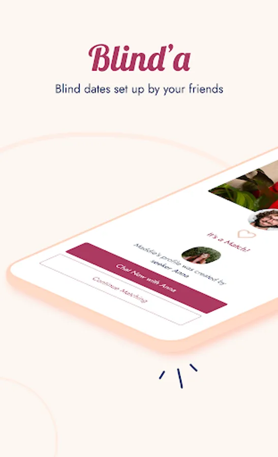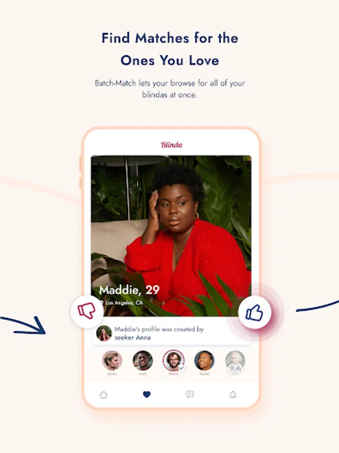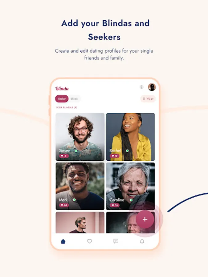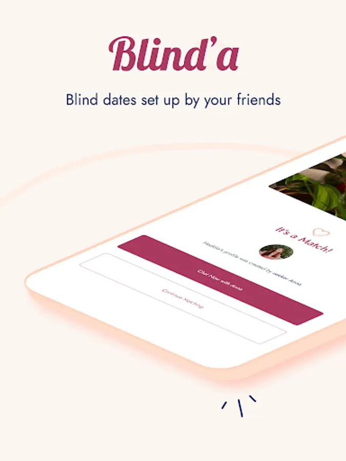 Blind'a allows users to matchmake for their friends, modernizing blind dating. Blind'a is divided into two roles: the person playing matchmaker, called a seeker; and the single person, called a blinda. Everyone can participate and Blind'a allows the seekers to present their friends from their unique point of view. Friends know each other best and know exactly what to look for in a potential match.