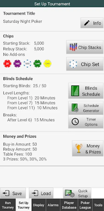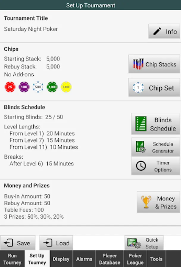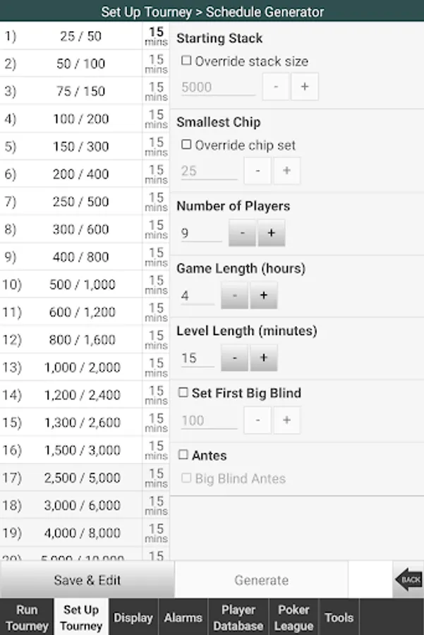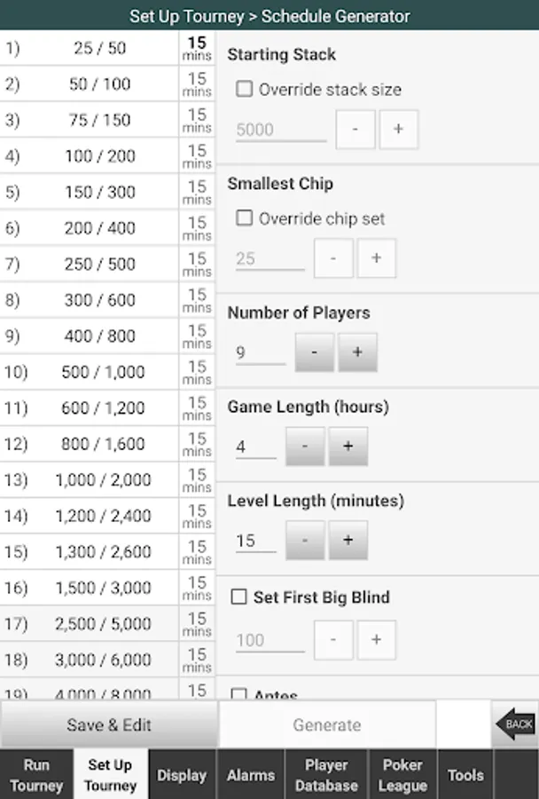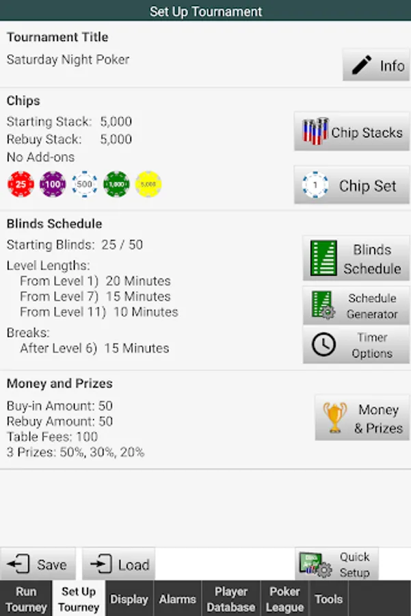 • Use the Schedule Editor to adjust level lengths, blind amounts, breaks, and custom level messages.