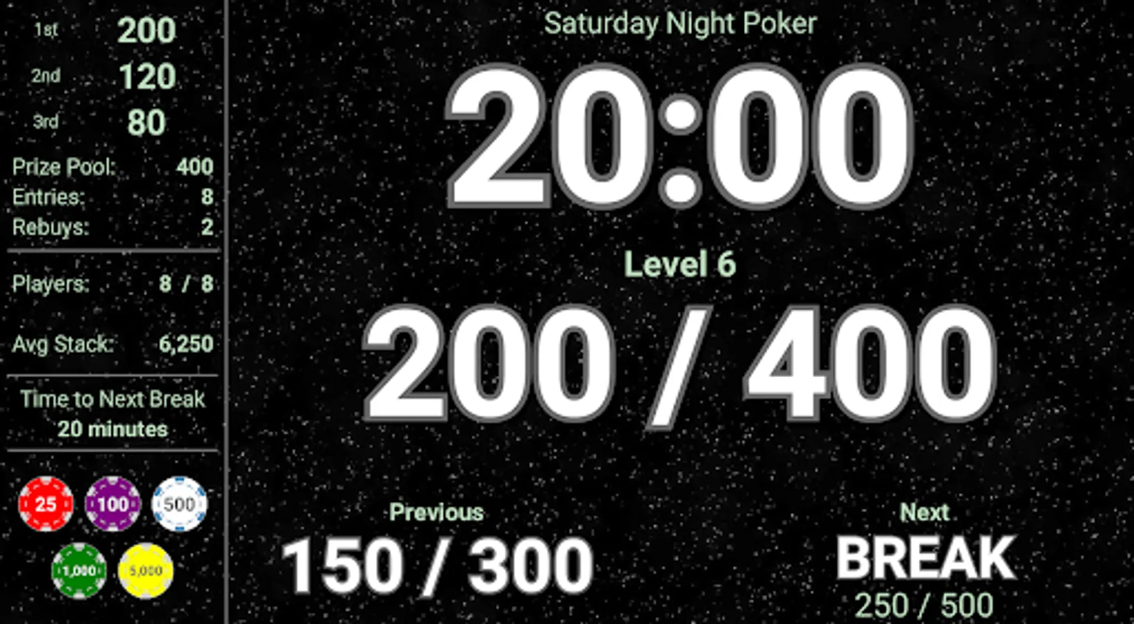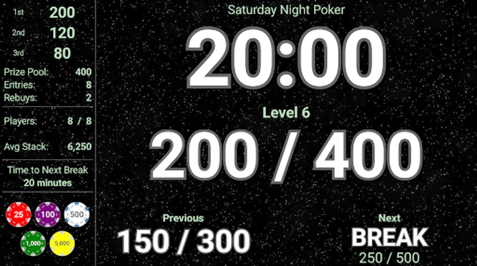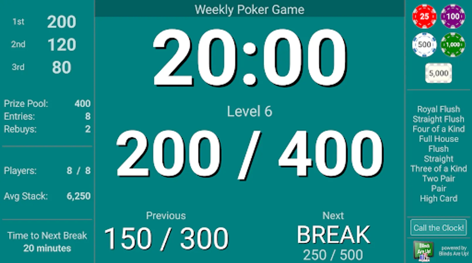 • Plus: Chip colours and values, time to next break, average chip stack, poker hand rankings.