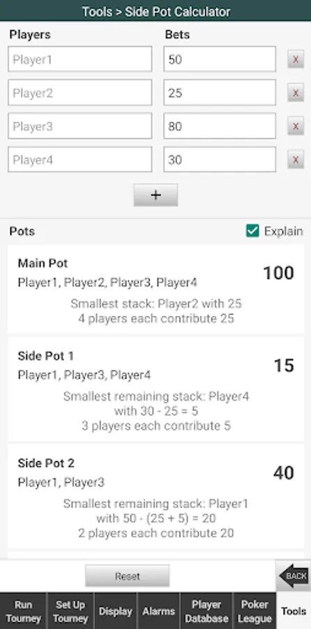 • The Side Pot Calculator gives you the correct pot sizes for multiple all-ins.