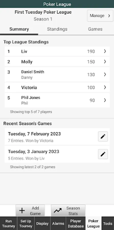 Everything you need to run your live poker games. Simple setup, customisable timer display and game settings, lots of helpful tools, a player database, and a poker league management system.