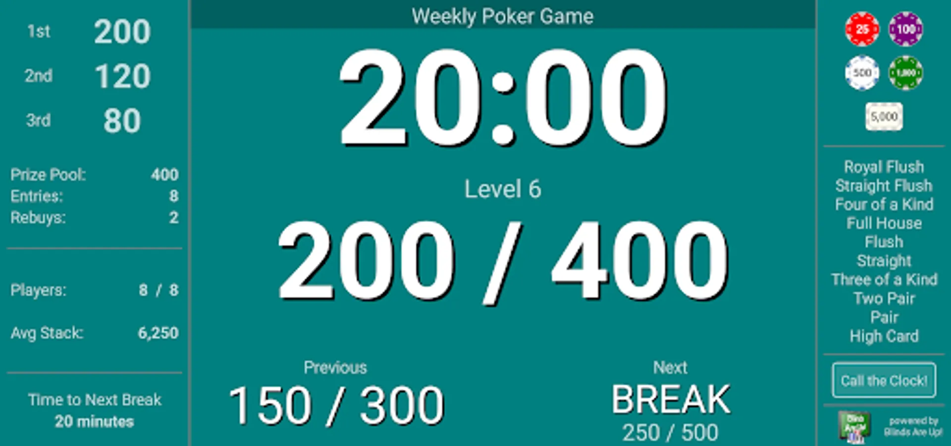 Blinds Are Up! is trusted by thousands of game organisers around the world to manage their home and club games, and to show their players all the essential information they need for a smoothly-run tournament.