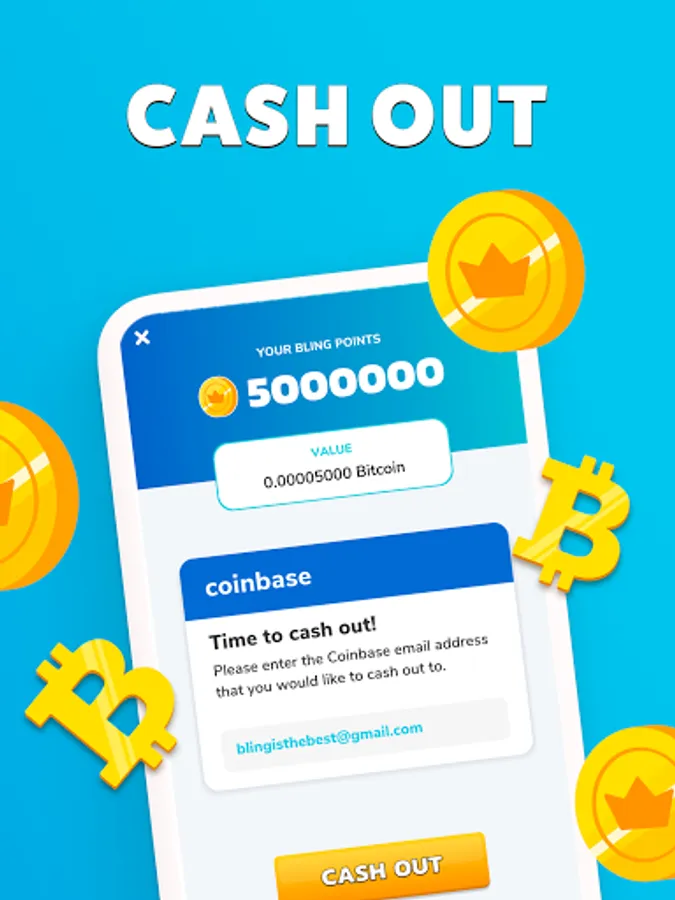 - Cash out your Bling Points for Bitcoin via Coinbase or USD via PayPal!