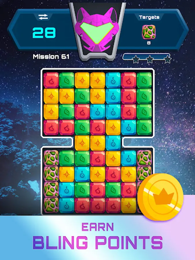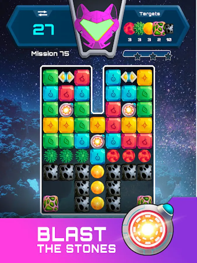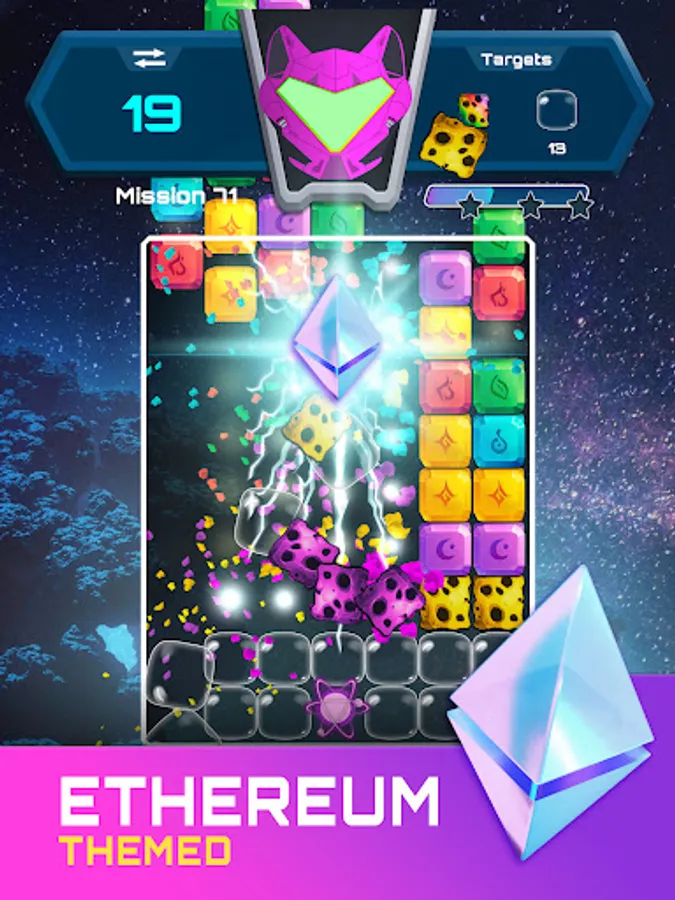 To collect the targets, you must match a minimum of 2 like-colored stones to clear them from the board and make way for new stones while clearing the path to collect your targeted Ethereum items. Throughout the game you can earn mesmerizing space themed power-ups that will help make it easier for you to collect the targeted items.