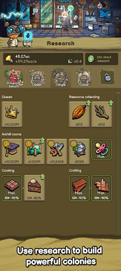 Join the idle ant colony to build the largest ant colony on earth. Play slow and max out your first anthill before you unlock the next continent or rush the first colony to gain great variety faster. Install idle ant colony now, have fun and get excited for upcoming new content. This is an idle clicker or incremental game which means you will generate ants and research points even when you are not actively playing.