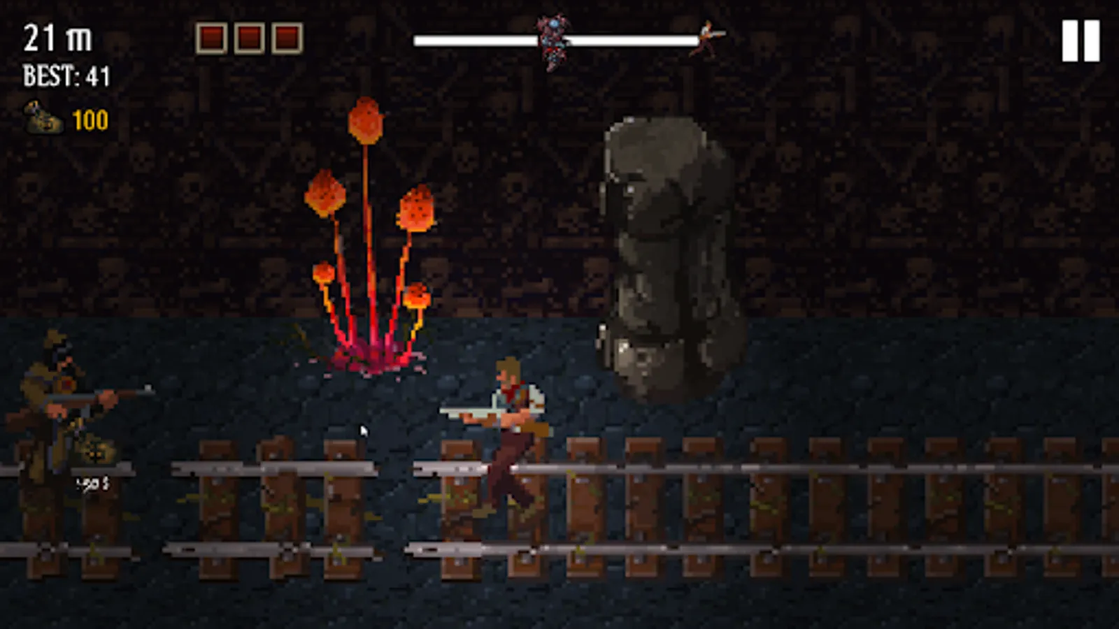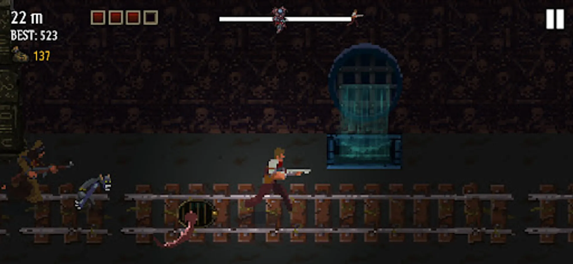 The main heroes run to escape from a huge flying polyp. If it catches the heroes, it will be their end. The goal is to get as far as possible. Defend yourself from the enemies that will try to kill or stop you. Shoot your weapon to defend yourself, and dodge the traps that will activate on your way. The enemies will drop items that will help you and money that you can use to buy new items at the game shop.
