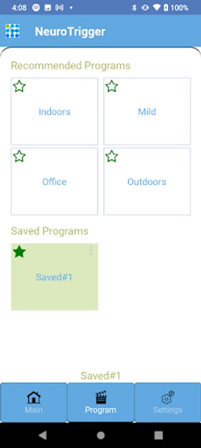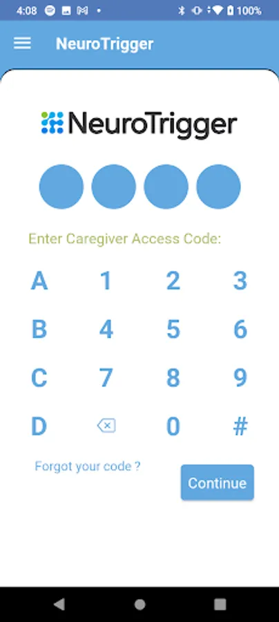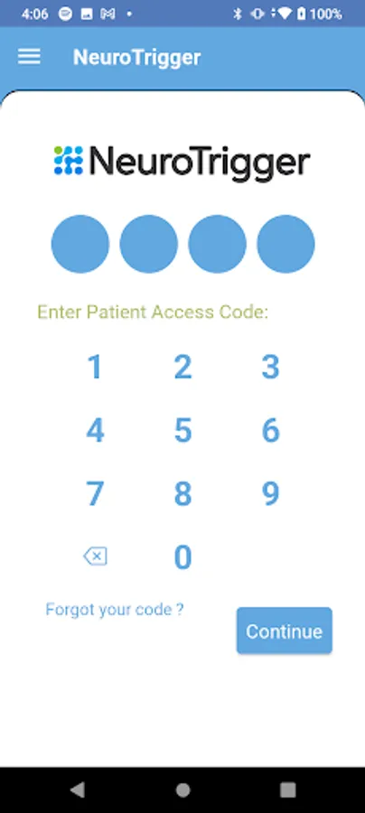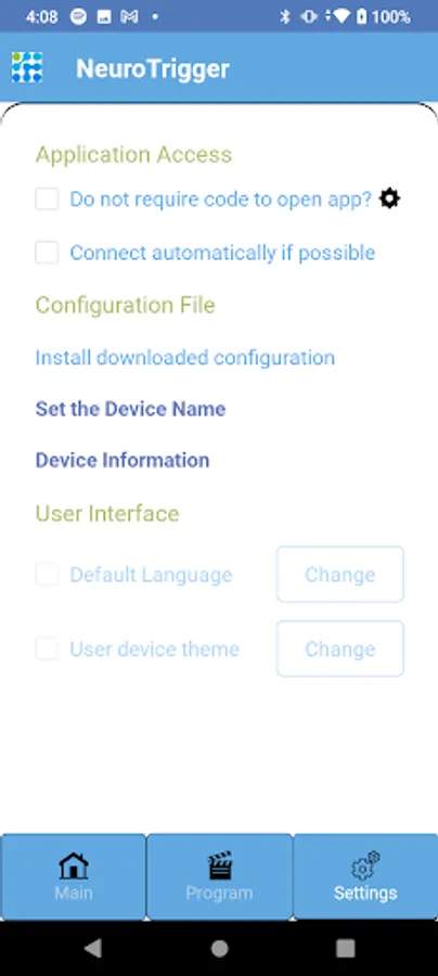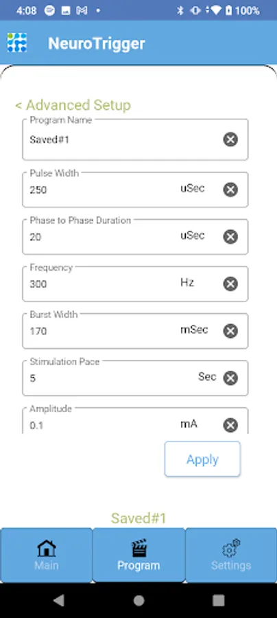 NeuroTrigger is an application developed to control the NeuroTrigger Basic – a powered muscle stimulator that delivers electrical stimulation to different body regions through a single use/disposable pre-gelled Y-shaped electrode. The application allows the user to control the stimulation intensity and frequency and displays a real time indication of the stimulator status .