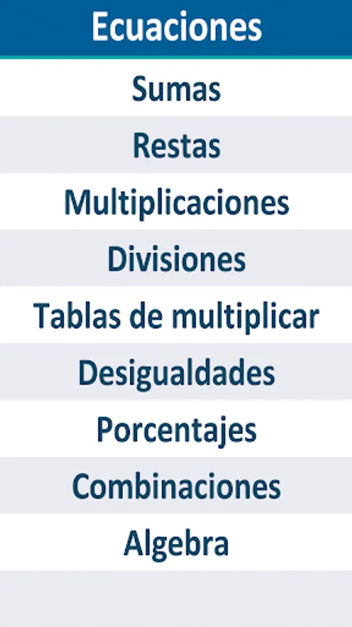 - Define 9 different types of equations with different types of operations: Addition, Subtraction, Multiplication, Division, Multiplication tables, Inequalities, Percentages, Combinations, Algebra