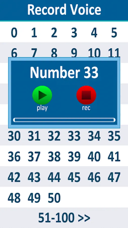 Record the pronunciation of the number using your own voice. The audio will be played when the number is shown or touching the center of the screen.