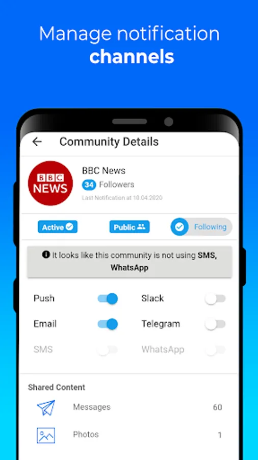 Using the mobile app, you can create a new community, follow communities you like, and send messages to the members of your community using the most convenient communication channel. You can reach your audience through SMS, email, web push, mobile push, Slack, Telegram. You can also customize how you would like to receive notifications from different communities by enabling and disabling each communication channel. So, community admin’s do not have to worry about being unsubscribed and followers do not have to worry about getting spammed.