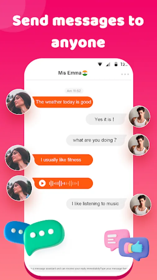 On the app, you can chat with anyone, you just need to send Hi or wait for other side reply, after that you can be friend and chat anytime with them. You can choose to chat with global users also.