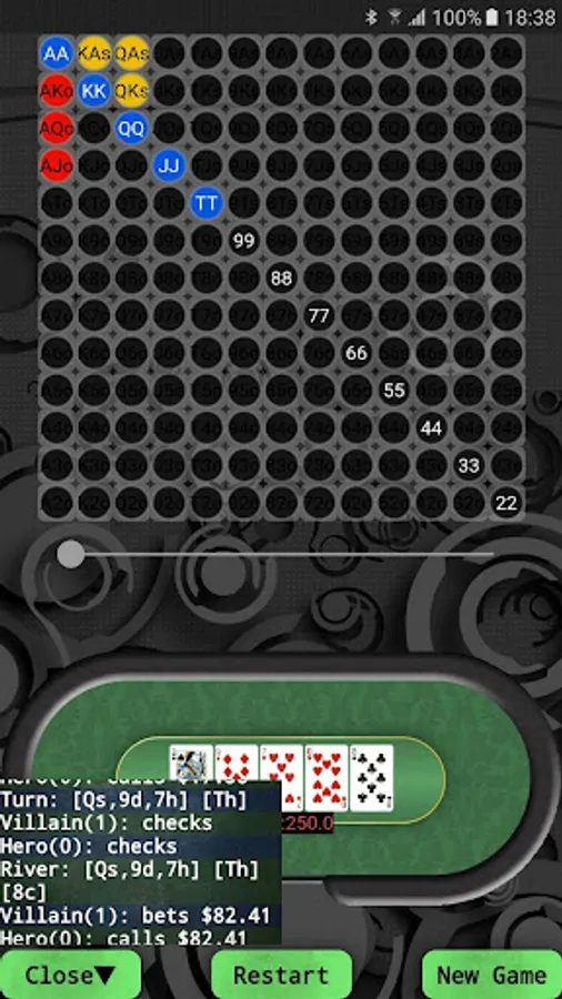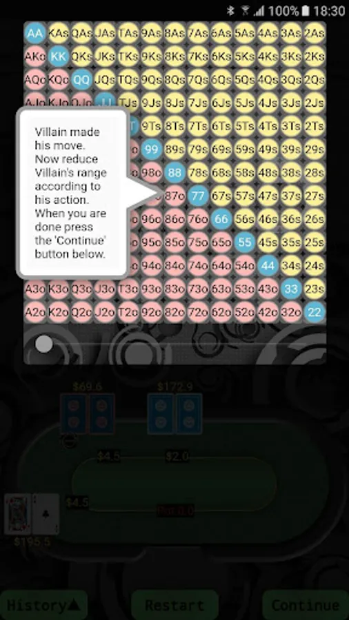 Use this app to improve your NL Texas Hold'em range reading. Replay hundreds of different scenarios and train how to put your opponent on a specific range using hands reduction approach. Practicing each day will train you to properly stop and rethink your opponent's range while playing.