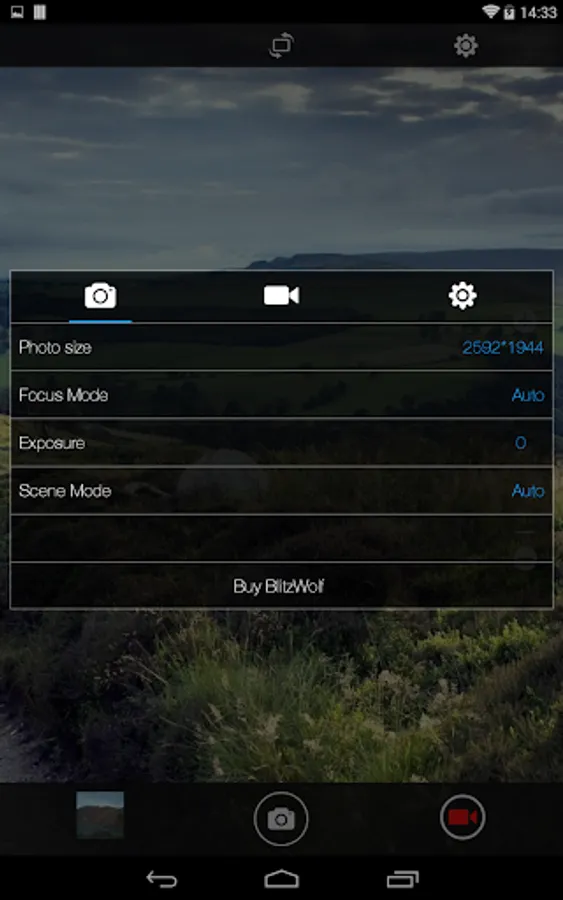 Manage your photo settings from within the App: including photo size, exposure, and focusing options.