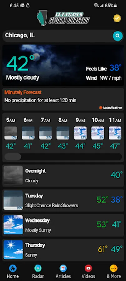 Live weather conditions from your neighborhood weather station, precipitation forecasts down to the minute. Hourly forecast out to 48 hours, and 7 days of detailed daily and nightly forecasts. Radar is interactive, NEXRAD data with industry-leading update times for a consumer weather app. Select your favorable radar color scheme and desired layers.