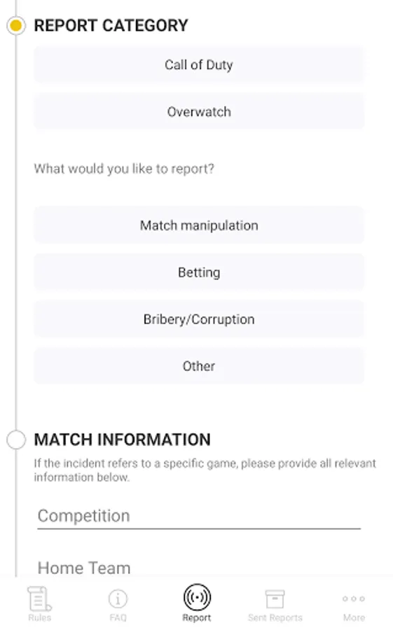 At Activision Blizzard, we are determined to provide players with a safe and fun environment to compete in all leagues and competitions at all levels. Our Integrity Reporting application is designed to do just that, providing you with a platform to report - safely and securely - any potential approaches that put the integrity of competition at risk. From match manipulation to bribery and corruption, the app is designed to equip players with the right technology to provide important information directly to the responsible stakeholders who protect fair play across all of our competitive leagues.