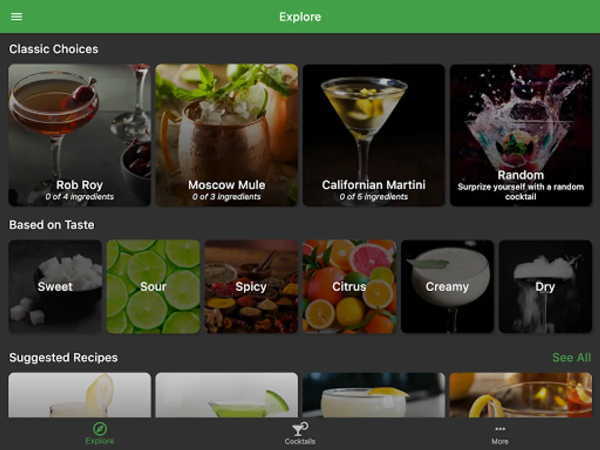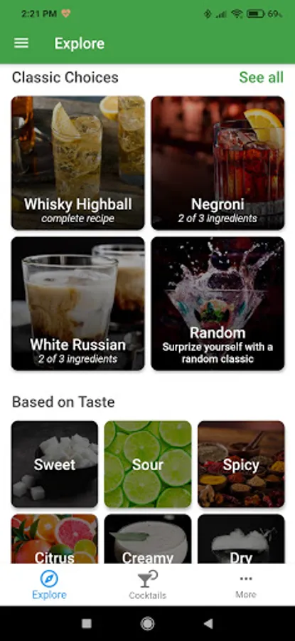 Browse cocktail recipes by categories: spirit, taste, classic choices, or why not surprise yourself with a random one?