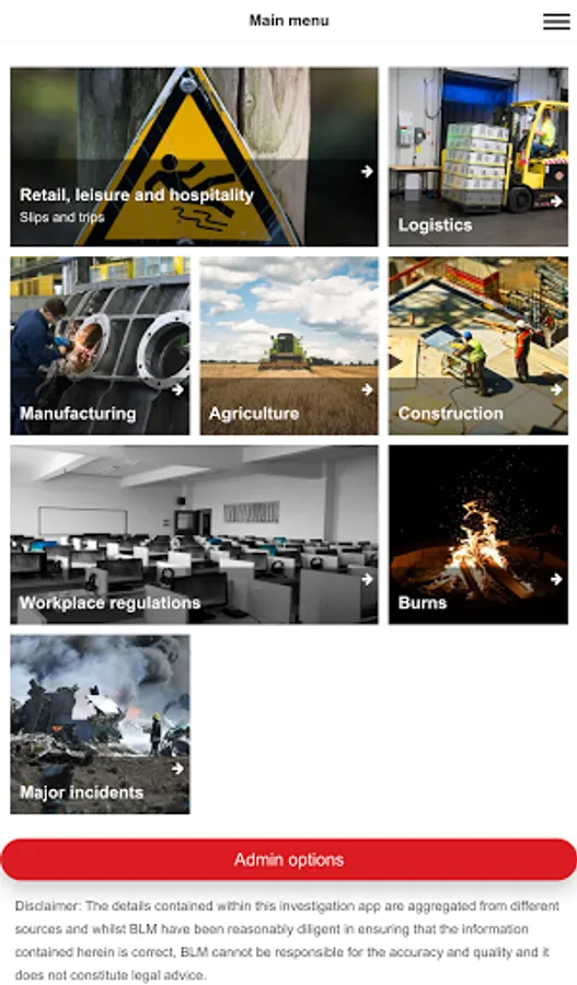 Welcome to the BLM investigation app. This app helps identify the investigations to carry out after an accident has occurred. It covers different sectors to include logistics, manufacturing, agriculture, construction and retail.