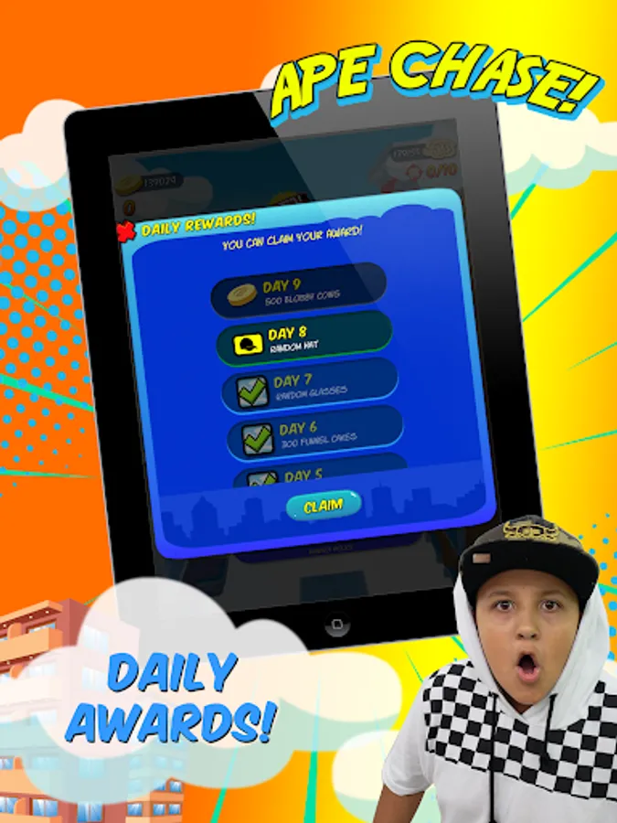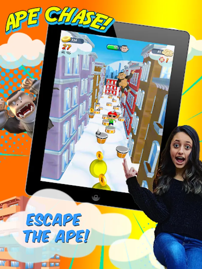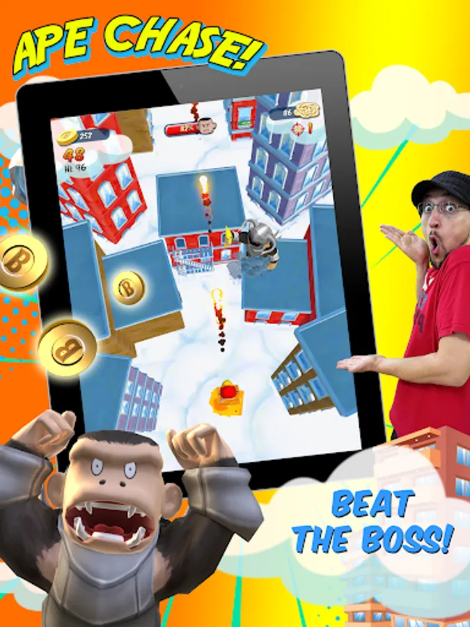 Simply drag your finger back and forth to safely land on platforms. Sound easy? Not so fast. Spikes, moving platforms and the ever looming distraction of the Ape in pursuit will challenge your quick reflexes and focus. Stay vigilant for the coveted laser pistol to turn the tables on the boss and subdue him in arena combat!