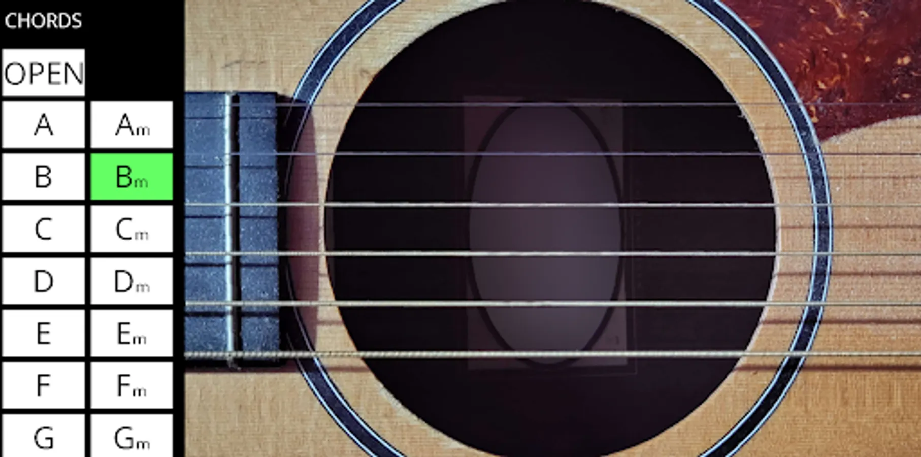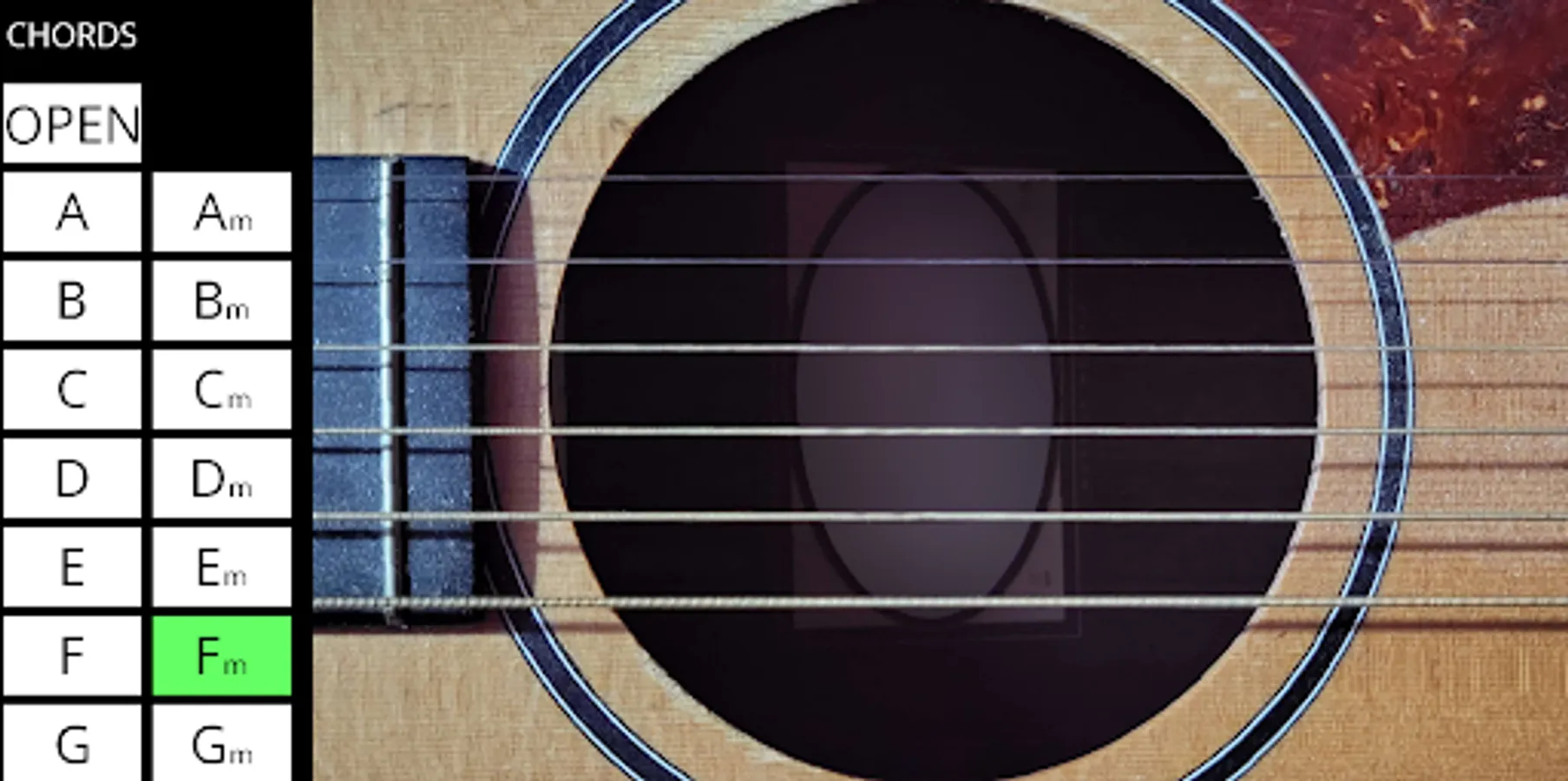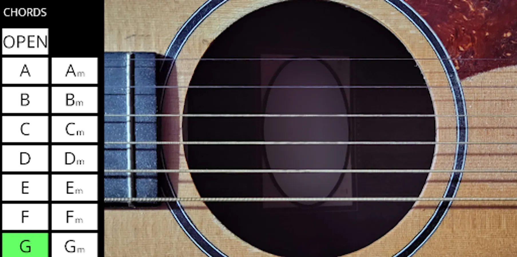 Choose between different chords and play the acoustic guitar all from the comfort of your phone! (No guitar skills required) simply choose a chord and strum the virtual strings to your heart's content!