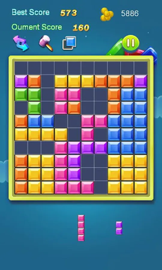 Drag blocks to fill up the block to Win and collect icons or golds to use game props.