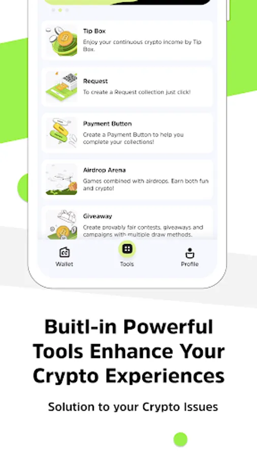 Powerful Crypto Toolkit: A range of powerful tools tailored to meet the diverse needs of the crypto community: Giveaways, Payment Request, Payment Button, Mobile Refills, Bulk Payment