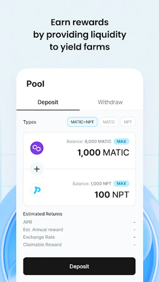 - Experience the convenience of Staking, Liquidity Staking, Pool Deposit, Swap and NFT available with minimal steps required