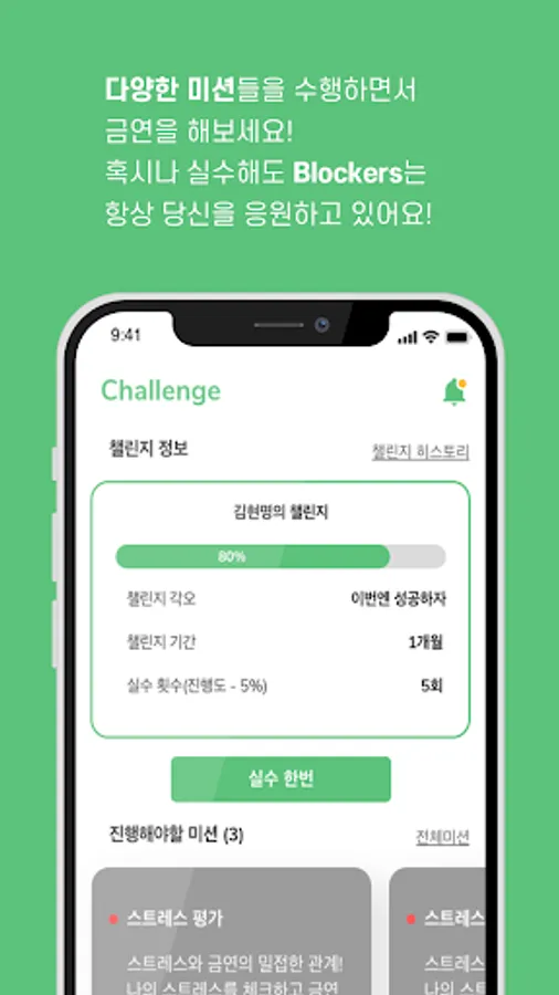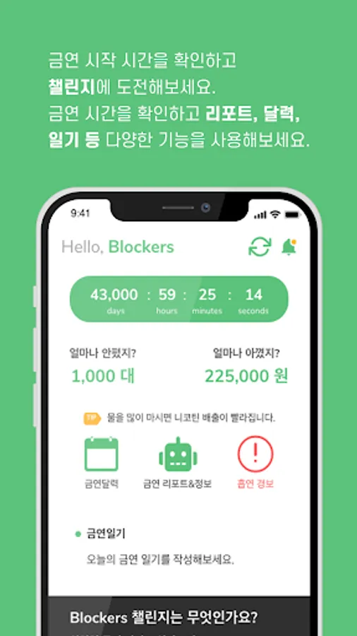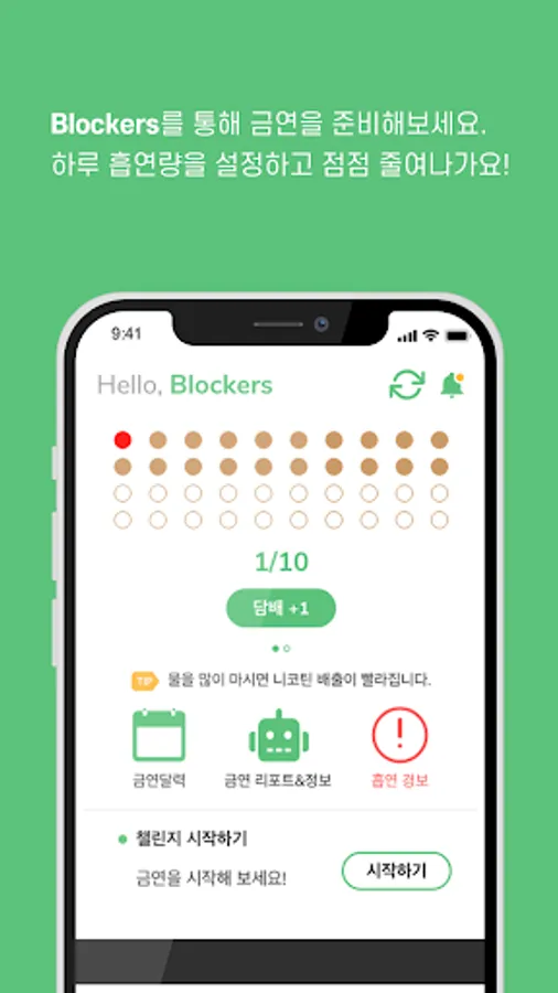 Blockers is a service that challenges smoking cessation by participating in challenges and performing missions. You can check the health report, you can use the smoking cessation diary, medication reminder, just wait once.