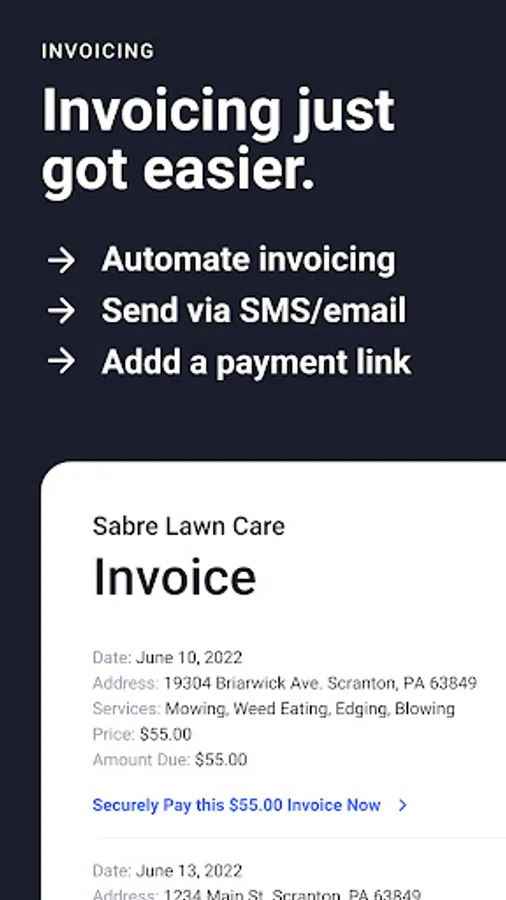- Invoicing: Finally, when you complete a job, we will automatically invoice them on a schedule you set, with your logo and customized notes on the invoice.