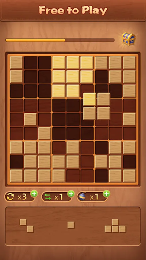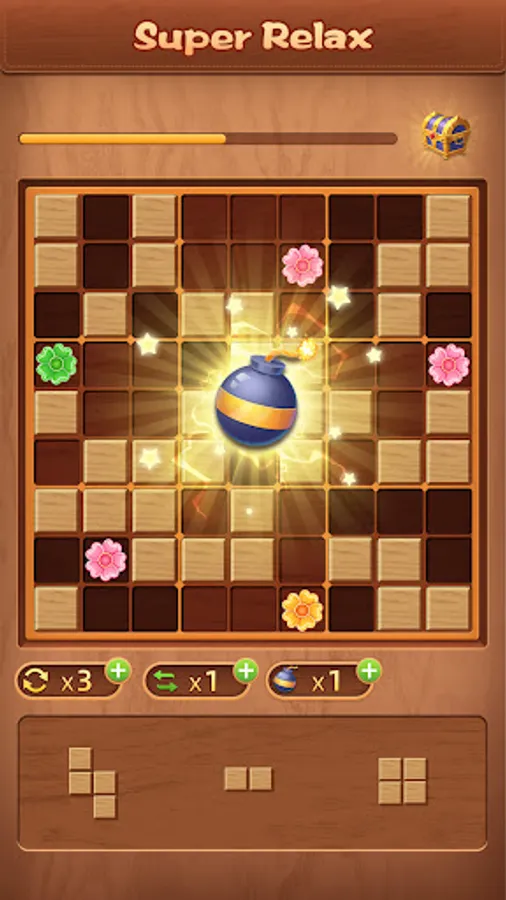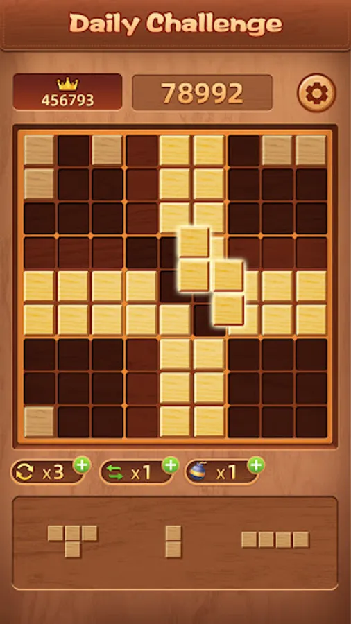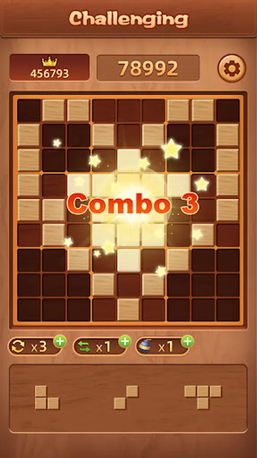🔖Draw the given blocks in the wooden grid to form vertical or horizontal lines or 3x3 squares to merge these blocks;