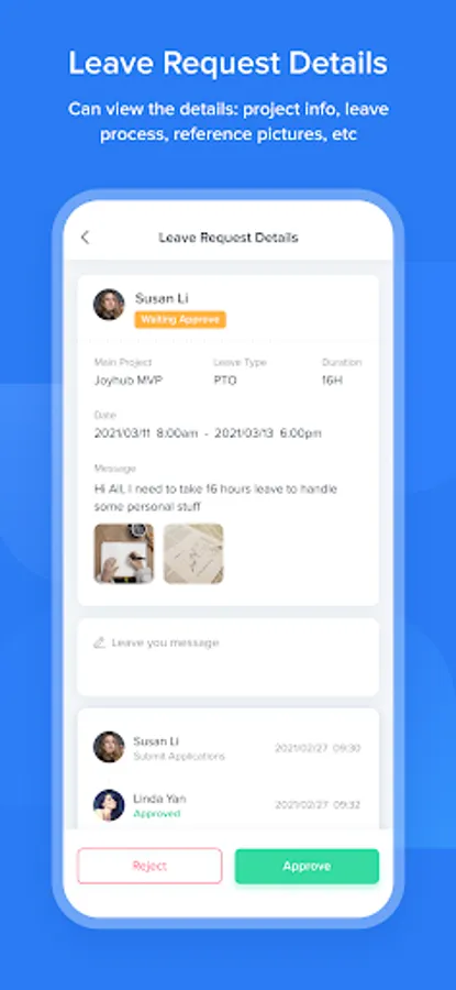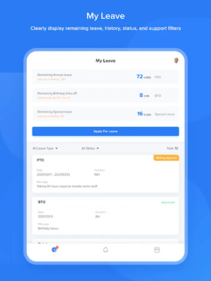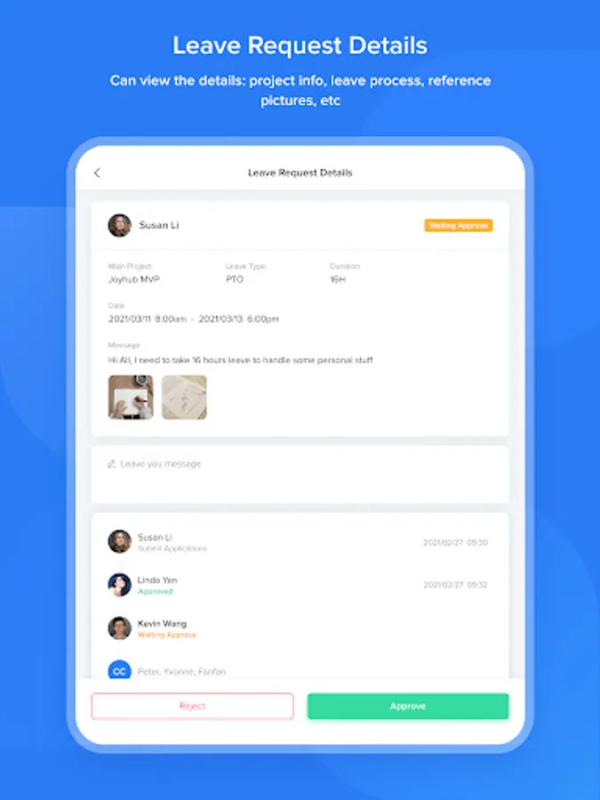 WCP is used for employees to apply for leave, leaders approve leave, and corresponding operations will be notified in time to help you manage projects flexibly.