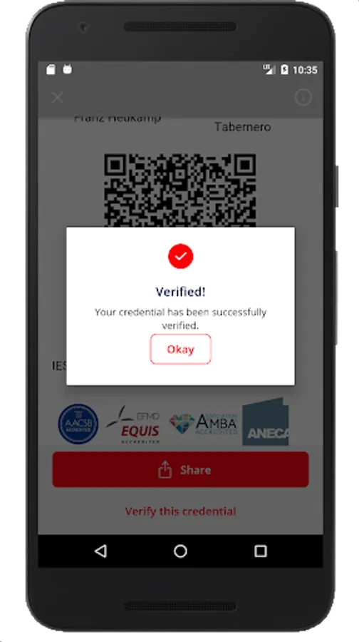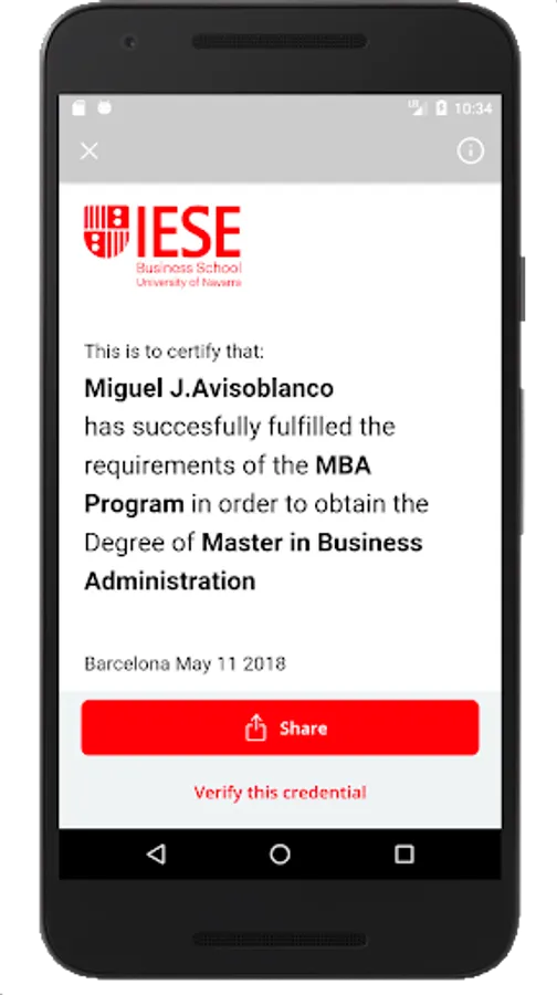 This wallet allows you to keep your academic and professional skills certificates in one place. The certificates are insured by Blockchain, and you can share them through your favorite social networks, or simply by showing the QR to whoever you want.