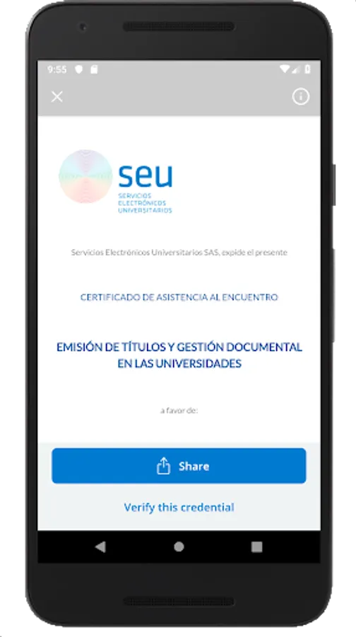 Always have your Academic Certificates available on your smartphone. You can share them with those people you want, in an easy way and through the social networks you want. And you can unequivocally show their veracity by comparing them with the digital signature of them stored in a public Blockchain chain by the Educational Institution that you attended and that issued them.