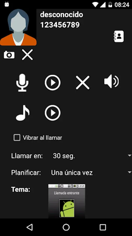 Fully customizable fake profiles contacts: name, number, photo, ringtone, voice, screen theme, vibration, scheduler and repeater call.
