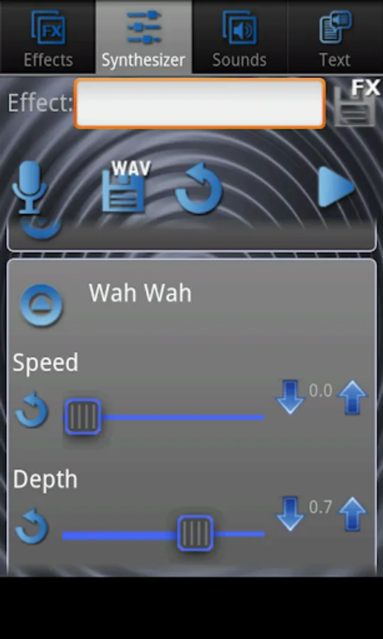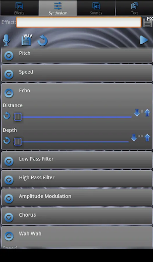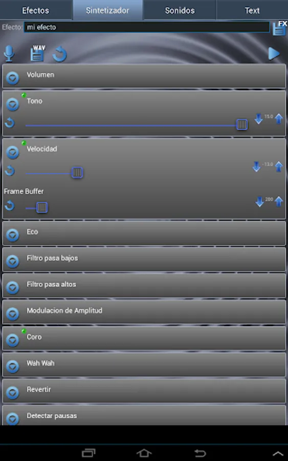 Configurable basic effects: pitch, speed, amplitude modulation, high pass filter, low pass filter, Chorus, Wah Wah, Alien Wah, Detection pauses between words, Echo, Reverse, etc.