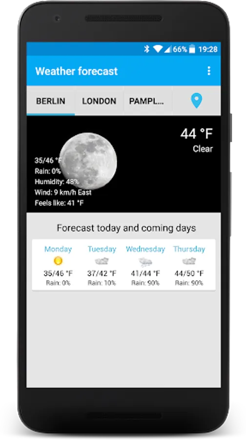 With Weather Forecast you can obtain the current situation (temperature, humidity and wind conditions) and forecast for the next four days simultaneously up to four different locations. Highlights: