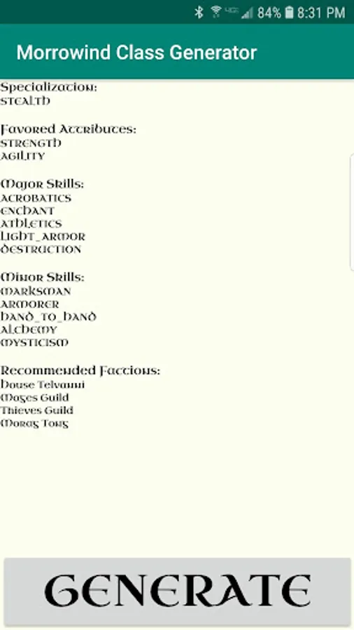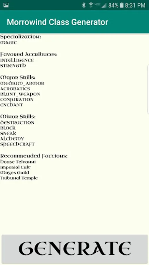 Generates specializations, favored attributes, major skills, minor skills, and recommended factions for The Elder Scrolls III: Morrowind.
